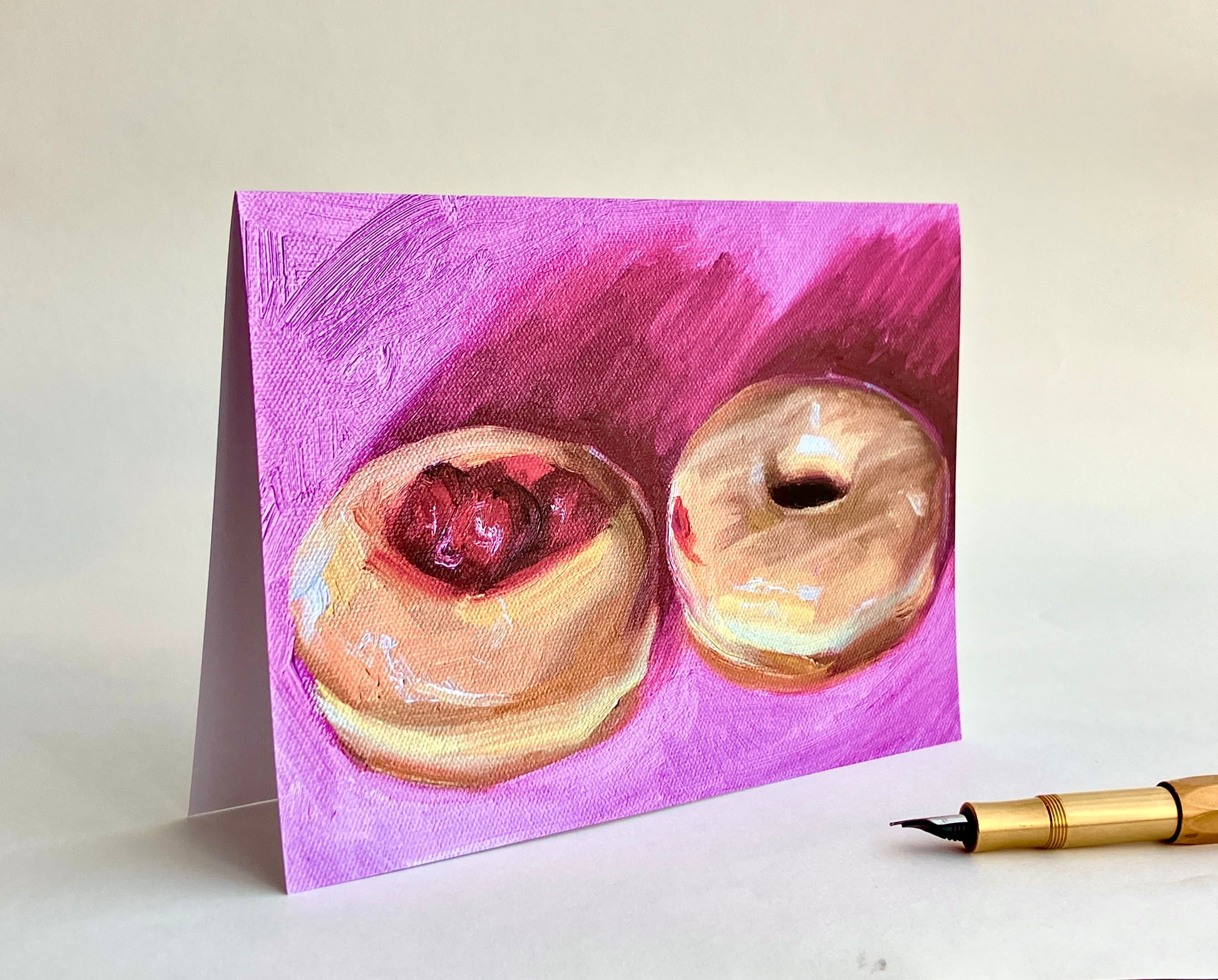 The original oil painting was inspired by two donuts smooshed together in a box… and one ended up with a kissy mark! 💋 Now, you can share a bite-sized piece of that art with these high-quality4.25”x5.5” note cards, featuring a print of my painting on the front